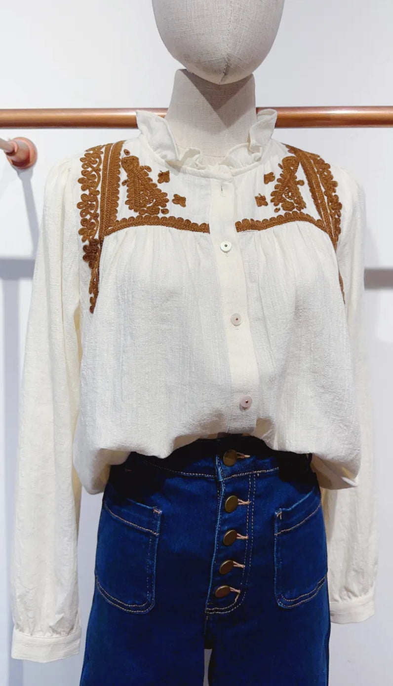 Jolie blouse 100% coton écru avec broderie camel. Elle ira très bien avec un jeans stone ou brut pour donner un petit cote bohème. Vous pouvez l'associer a un petit gilet mouton.